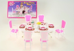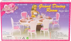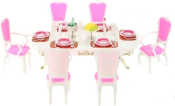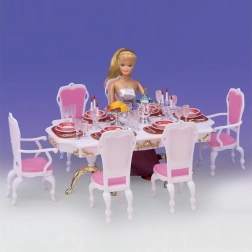 Stilski set Glorie za lutkarsko blagovanje pretvara svaku sobicu u elegantnu blagovaonicu. Sadrži veliki plastični stol, 6 stolica (2 s naslonima za ruke) i bogato postavljeno posuđe uključujući čaše, tanjure i pribor za jelo. Idealan za kreativnu igru djece od 3 godine.