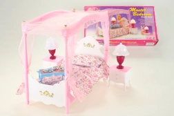 Priuštite lutkama luksuzan san s elegantnim GLORIE krevetom s baldahinom. Set uključuje krevet s prekrivačem i jastučićem, dva noćna ormarića i dvije lampice koje se nakon zakretanja cilindra zasvijetle. Idealan za kreativnu igru i stilizirane kućice za lutke.