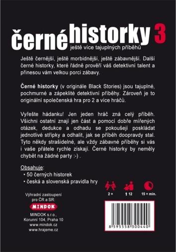 Crne priče 3 donose još mračnije, morbídnije i zabavnije priče koje će vas nasmijati, ali i zagolicati moždane vijuge. Jedan igrač zna cijeli slučaj, ostali uz pomoć pitanja, dedukcije i logike nastoje posložiti djeliće i razriješiti zagonetku. Idealno za večeri s prijateljima, obiteljska okupljanja i kao ledolomac na partyju.