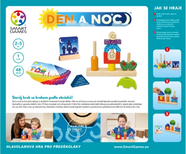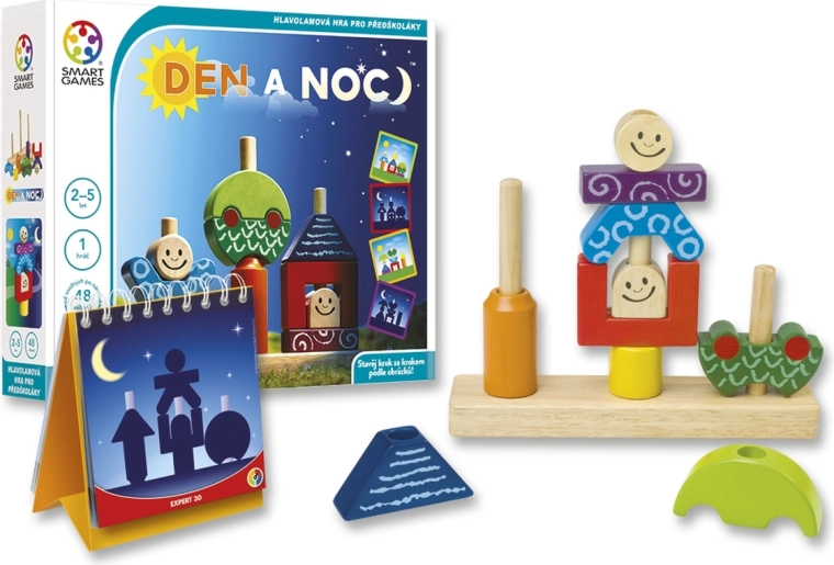 Dan i noć je domišljato osmišljena logička igra za jednog igrača koja djecu vodi od prvih jednostavnih slagalica do zahtjevnijih prostornih zadataka. Na dnevnim kartama vide se svi detalji, dok noćne karte prikazuju samo obrise – tako dijete vježba maštu, pažnju i finu motoriku.