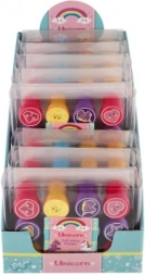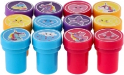 Set nudi raznoliku paletu preslatkih motiva (jednorozi, zvijezde, srca, oblaci itd.) u 4 vesele boje. Pečati imaju kompaktnu veličinu 3 cm, udobno leže u maloj dječjoj ruci i potiču razvoj fine motorike i mašte.