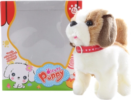 Hodajući i lajući plišani psić na 2× AA baterije. Interaktivna igračka za djecu od 3 godine, jednostavno upravljanje, kompaktna veličina 14 × 16 cm.
