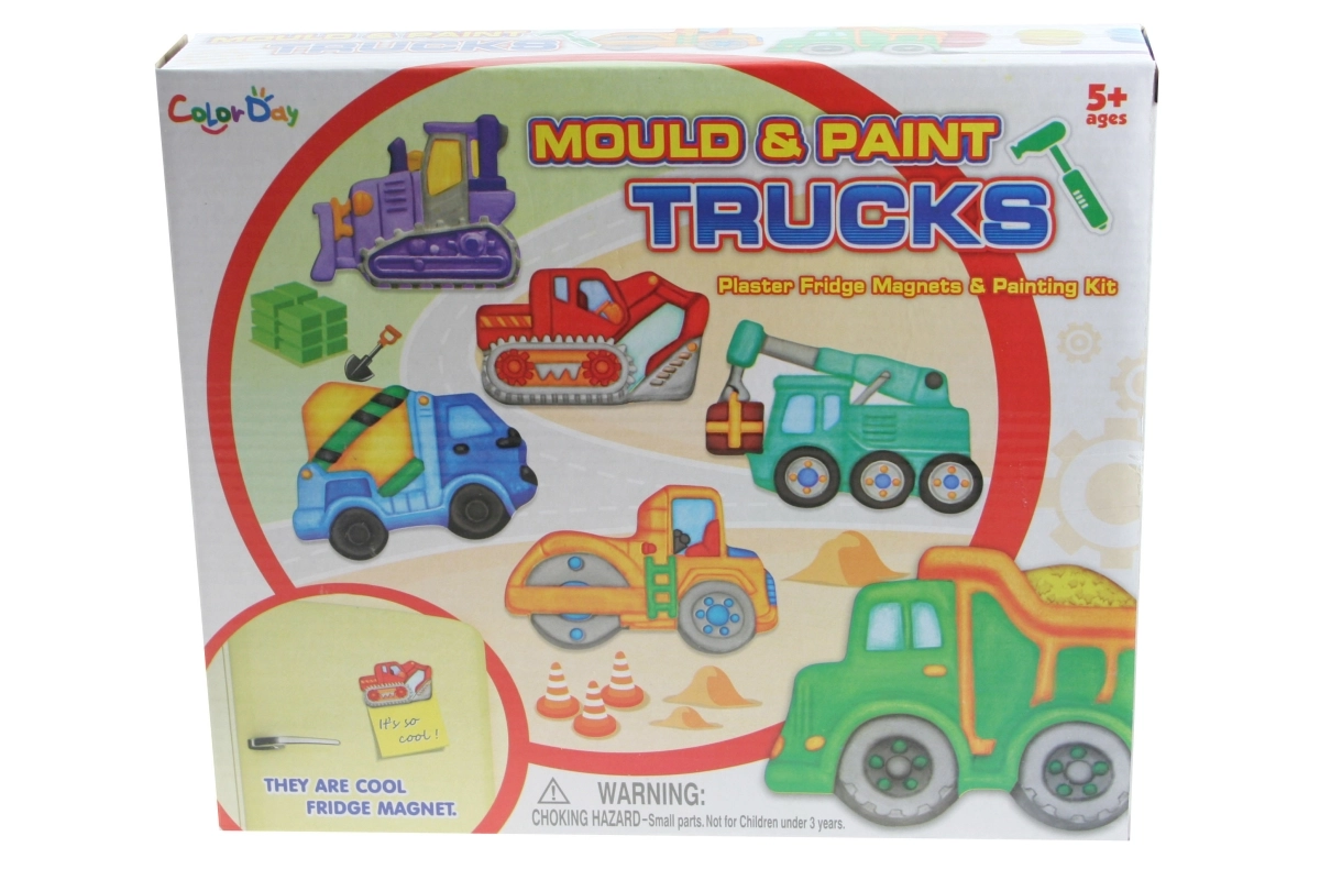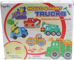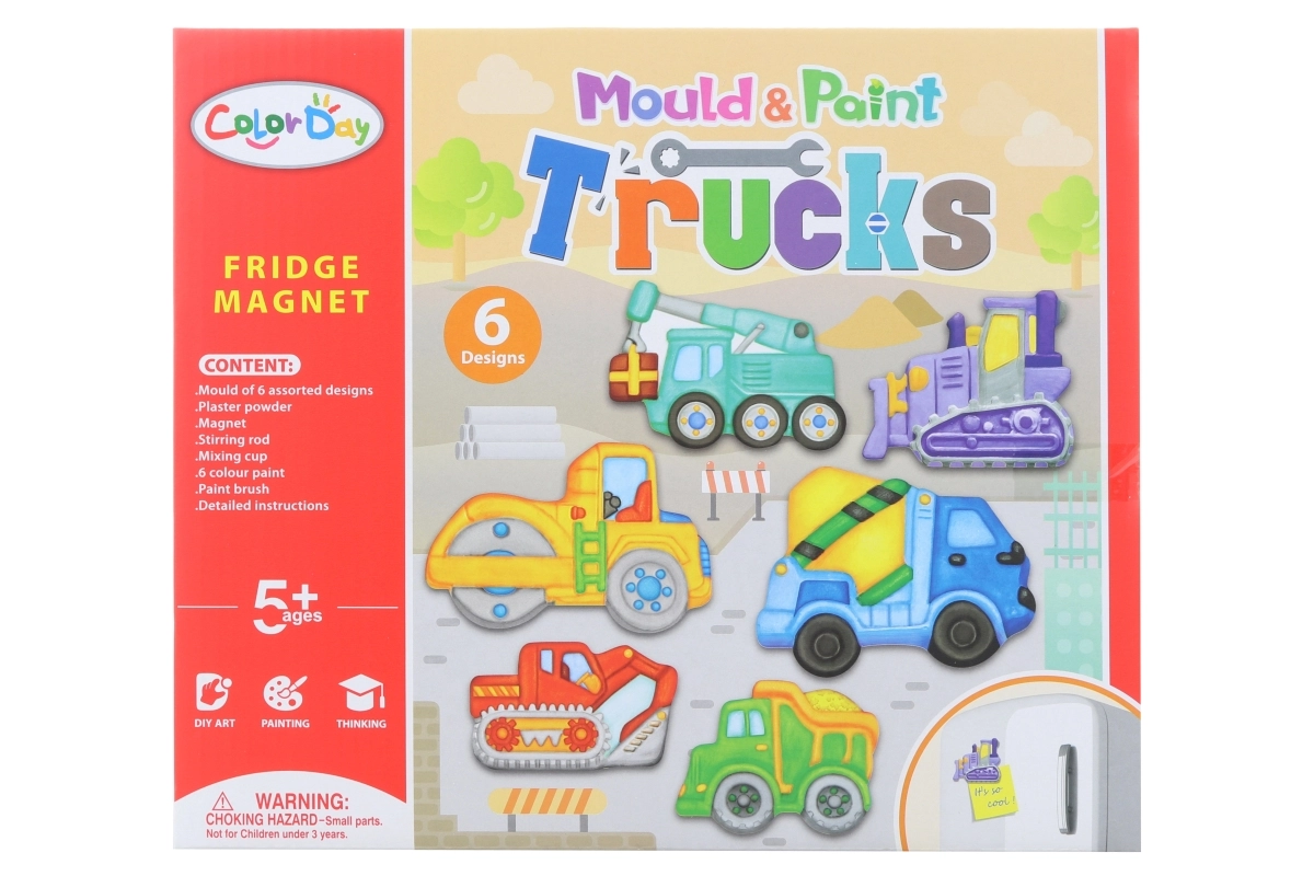 Pretvorite stvaranje u pustolovinu na gradilištu. Uz ovaj set djeca će izliti magnete od gipsa u kalup sa 6 motiva građevinskih vozila, obojiti ih priloženim bojama i pomoću magneta stvoriti vesele ukrase za hladnjak ili magnetsku ploču.