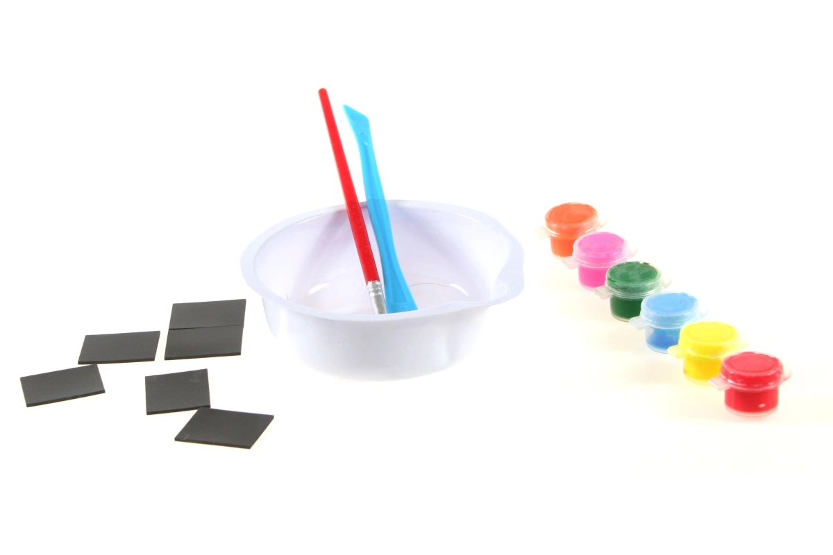 - Gips, plastična posudica, plastični kalup sa 6 motiva, 6 boja, kist, magneti, upute