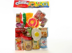 Zabavan set dječje hrane u vrećici za male kuhare. Sadrži razne namirnice od plastike i papira u praktičnom pakiranju veličine cca 31 × 21 cm. Idealan za razvoj mašte, socijalnih vještina i igru trgovine ili kuhinje. Sigurna izrada, jednostavno odlaganje i prikladno od 3 godine.