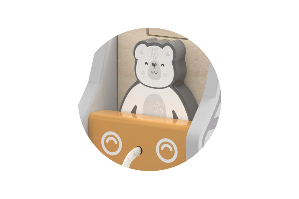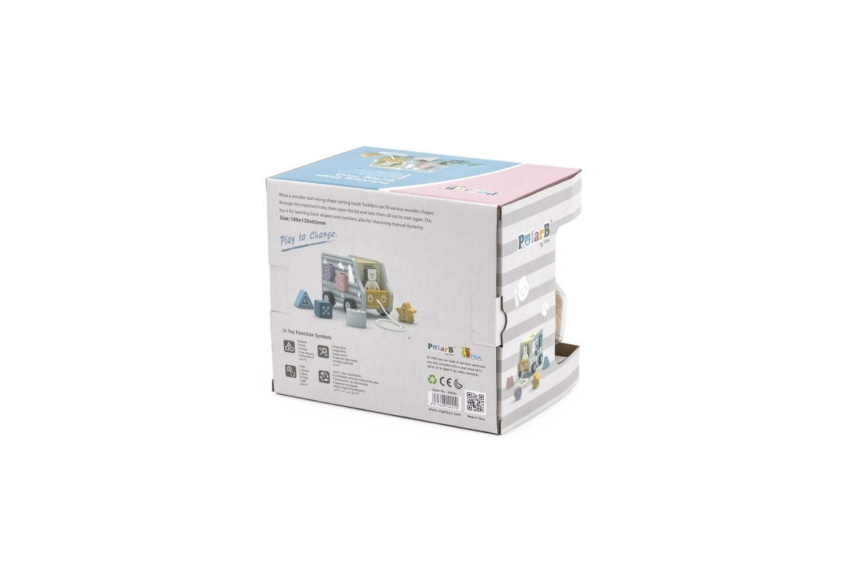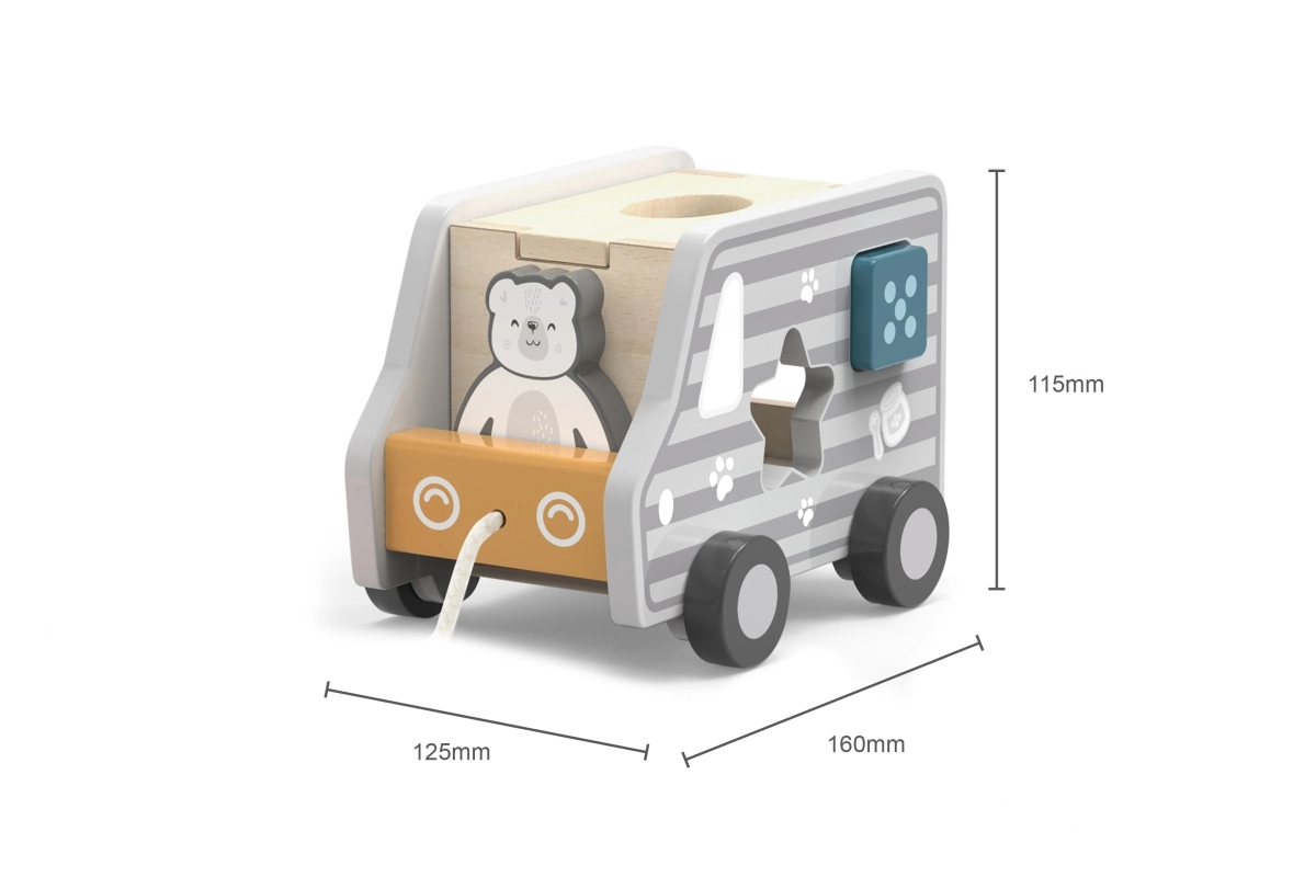 Drvena vučna igračka i umetaljka u obliku kamiona. Dimenzije cca 18 x 12 x 6,5 cm. Dimenzije pakiranja cca 19 x 16,5 x 13,5 cm. Dob 18m+