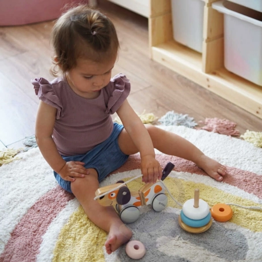 Igračka razvija koordinaciju, kreativnost i maštu te lijepo upotpunjuje kolekciju drvenih igračaka u prigušenim bojama. Prikladna za svakodnevnu igru kod kuće i na putu.