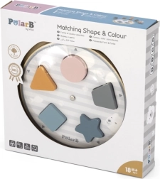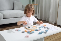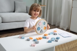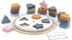 Djeca pridružuju drvene dijelove izrezima na ploči i pritom prirodno usvajaju boje i osnovne oblike – krug, kvadrat, trokut ili zvijezdu.