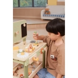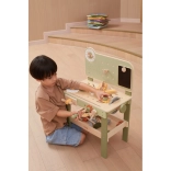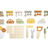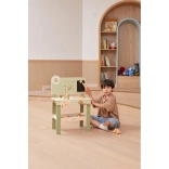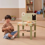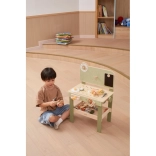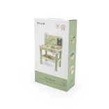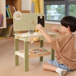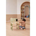 Stilizirani dječji radni stol u prirodno-zelenoj kombinaciji pruža realističan doživljaj radionice u sigurnoj, drvenoj verziji. Djeca mogu zavrtati, mijenjati kotače na autiću, “rezati” dijelove, slagati zupčanike i otkrivati principe uzroka i posljedice. Zahvaljujući preglednom prostoru za pohranu svi dijelovi i alat uvijek su pri ruci.