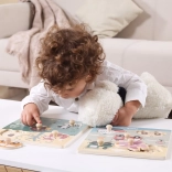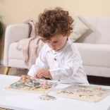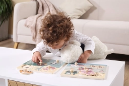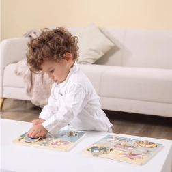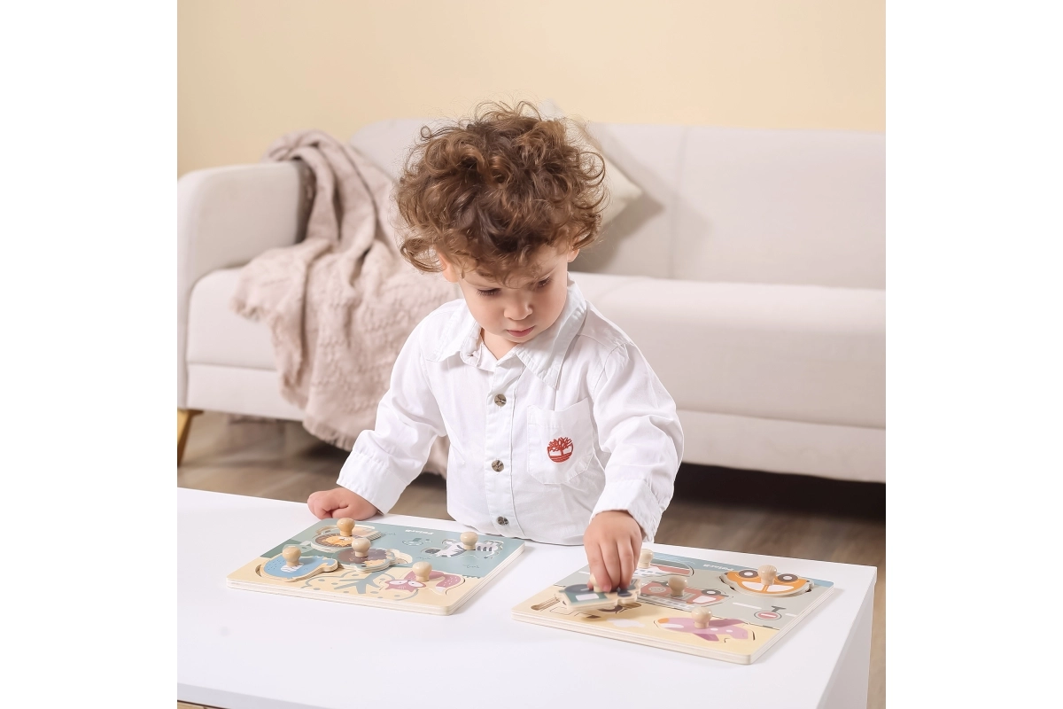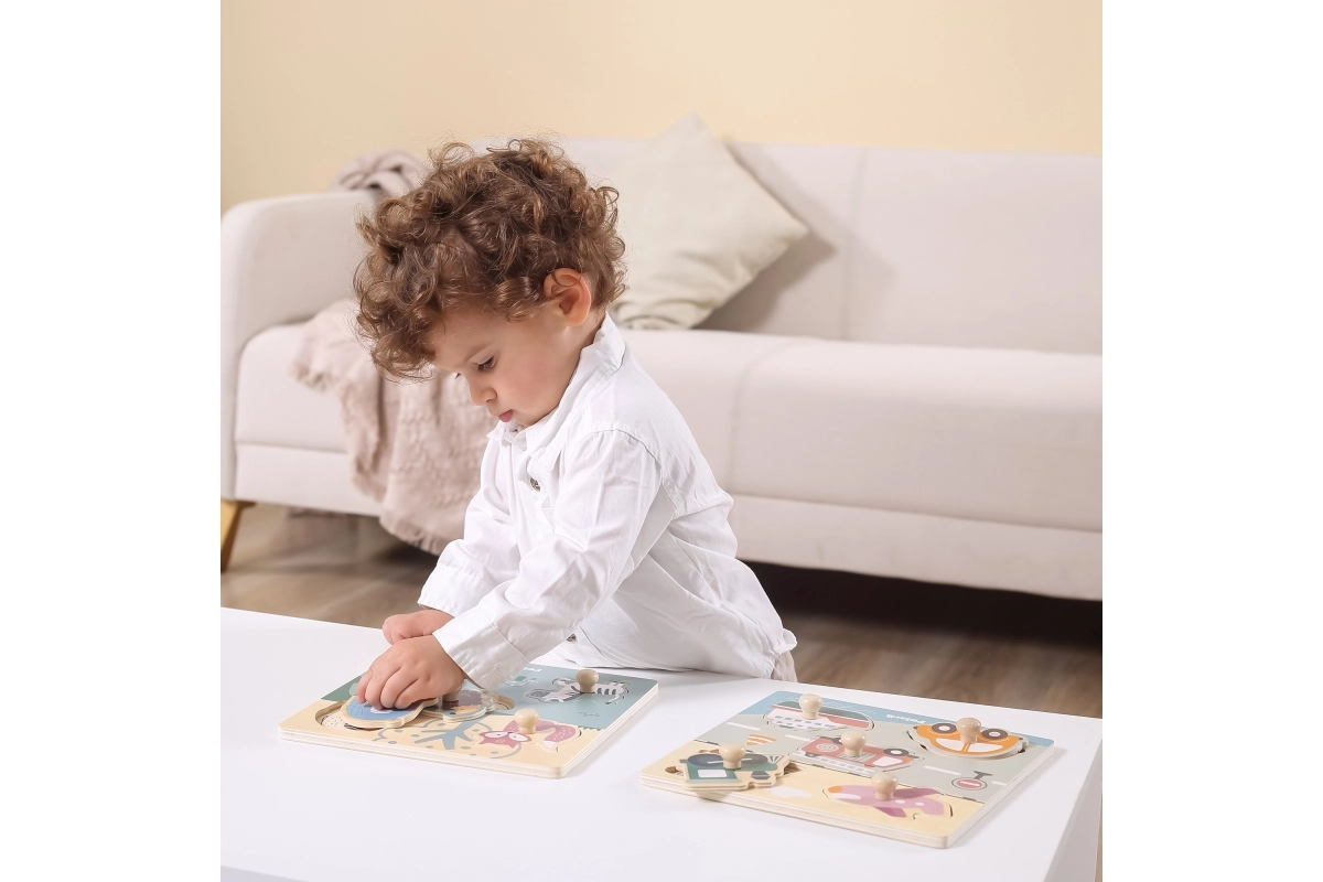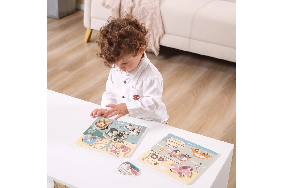 Drvena slagalica s motivom prijevoznih sredstava. Dimenzije drvene ploče cca 22 x 22 cm. Dimenzije pakiranja cca 22 x 22 x 2,5 cm. Dob 18m+