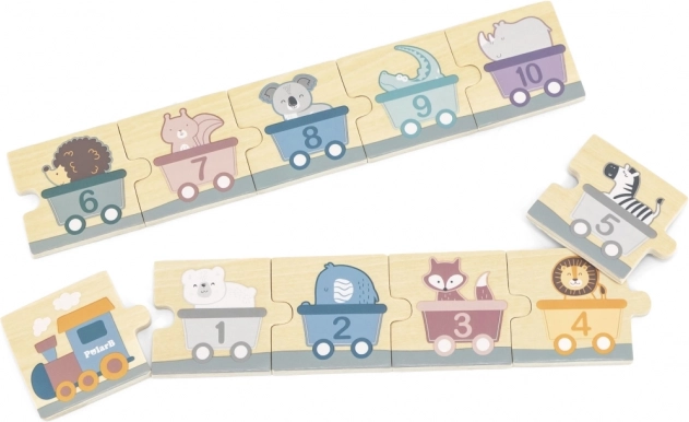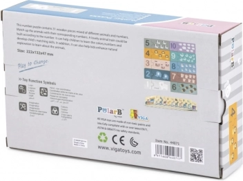 Sadrži ukupno 31 drveni dio s ilustracijama životinja i brojeva koje djeca povezuju i slažu ispravnim redoslijedom. Kvalitetna drvena izrada, ugodne boje i izdržljivost čine set izvrsnim izborom za svakodnevnu igru i učenje.