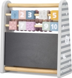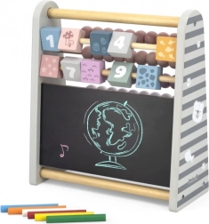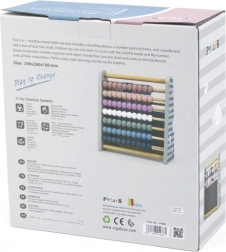 Ovo multifunkcionalno drveno brojalo 3 u 1 spaja učenje i igru u cjelinu. Djeca uz pomoć šarenih perli vježbaju računanje, s preklapajućim kockicama s brojevima uče prepoznavati znamenke i jednostavne odnose, a na ploči s kredom mogu pisati ili crtati svoje prve zadatke i crteže.