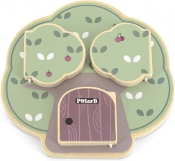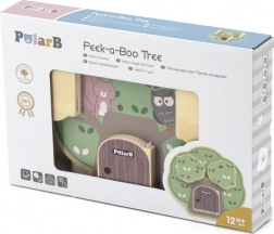 Drvena igra Peek‑a‑Boo stablo od POLARB-a osmišljena je za razigrano otkrivanje. Djeca pomiču i okreću dijelove, kucaju na vratašca i pronalaze slatke stanare stabla – sovicu, vjevericu ili ježa. Ova interaktivna igra prirodno razvija koordinaciju oko‑ruka i potiče znatiželju.