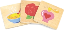 VIGA edukativna igra drvene puzzle nudi idealan način kako djeca mogu razviti svoje razmišljanje i koordinaciju. Cilj je povezati predmete s odabranim osjetilima, što uključuje razne svakodnevne objekte.