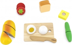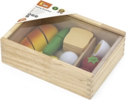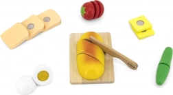 Drvena garnitura hrane za rezanje donosi djeci zabavu u igri na kuhara i poboljšava njihovu finu motoriku. Set uključuje drveni nož, dasku za rezanje i razne namirnice kao kruh, rajčicu, krastavac i jaje.