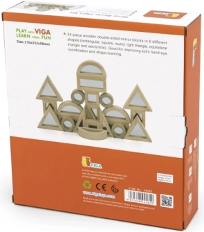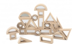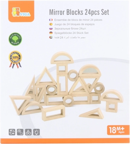 Set sadrži 24 drvene dvostrane kocke sa zrcalima koje djeci pomažu razvijati koordinaciju oka i ruke te prepoznavanje različitih oblika. U pakiranju se nalazi šest različitih oblika, uključujući pravokutne, kvadratne, okrugle, pravokutne trokutove, jednakostranične trokute i polukružne oblike. Zahvaljujući zrcalima djeca također razvijaju osjećaj vlastitog „ja“, što povećava njihovo samopouzdanje.