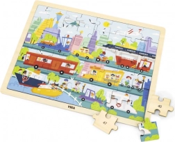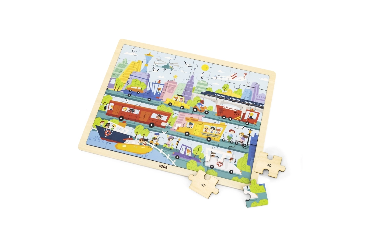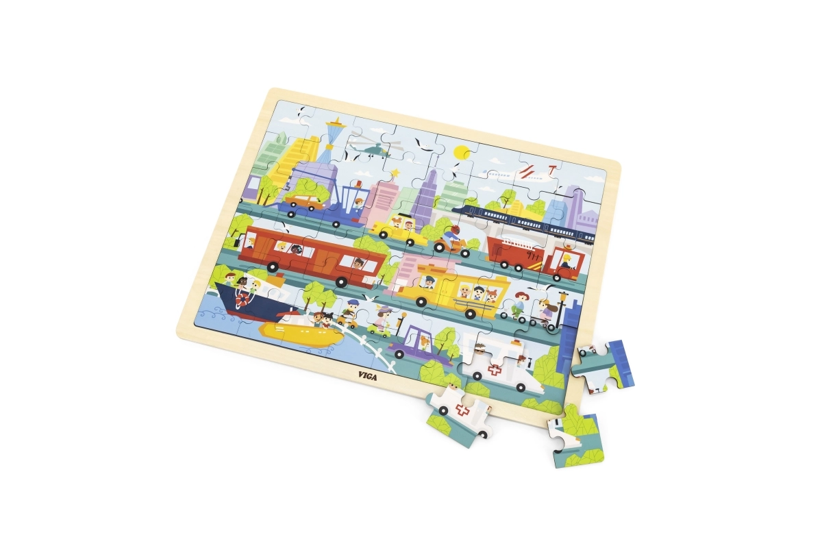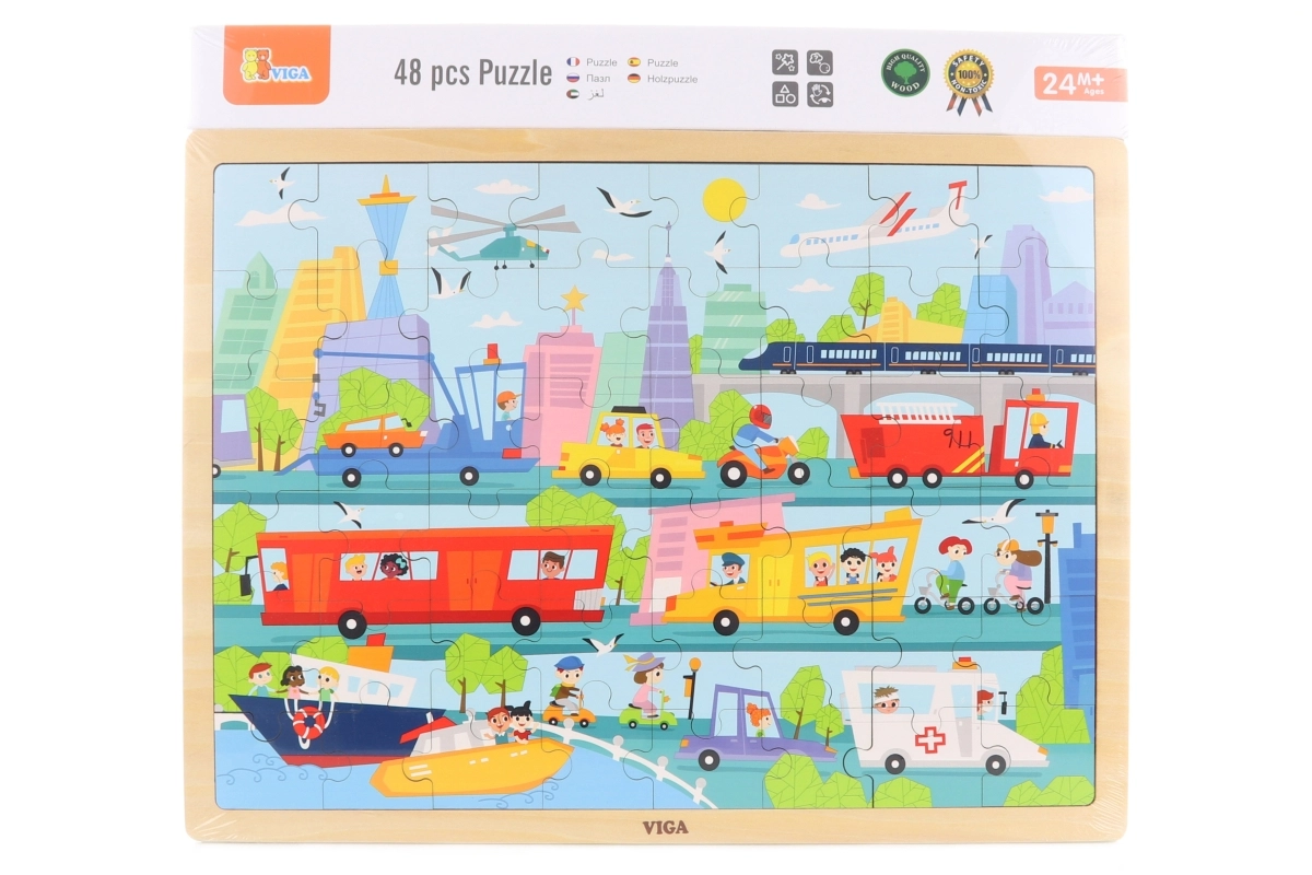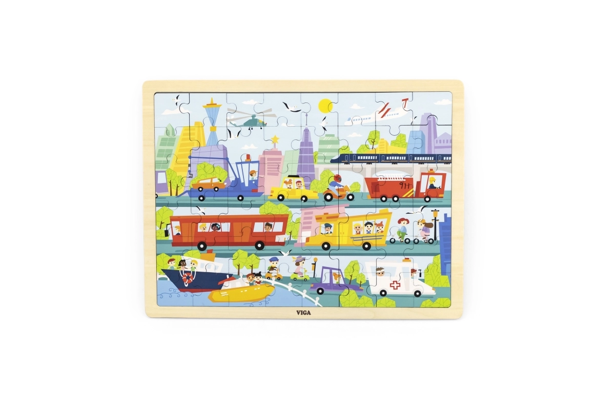 Ove kvalitetne drvene puzzle s raznolikom scenom grada i prijevoznih sredstava oduševit će male istraživače. Zahvaljujući 48 dijelova i čvrstom okviru, djeca vježbaju koncentraciju, koordinaciju oko–ruka i strpljenje. Jasne boje i razumljive ilustracije motiviraju na ponovno slaganje.