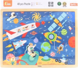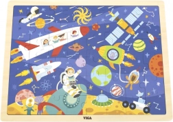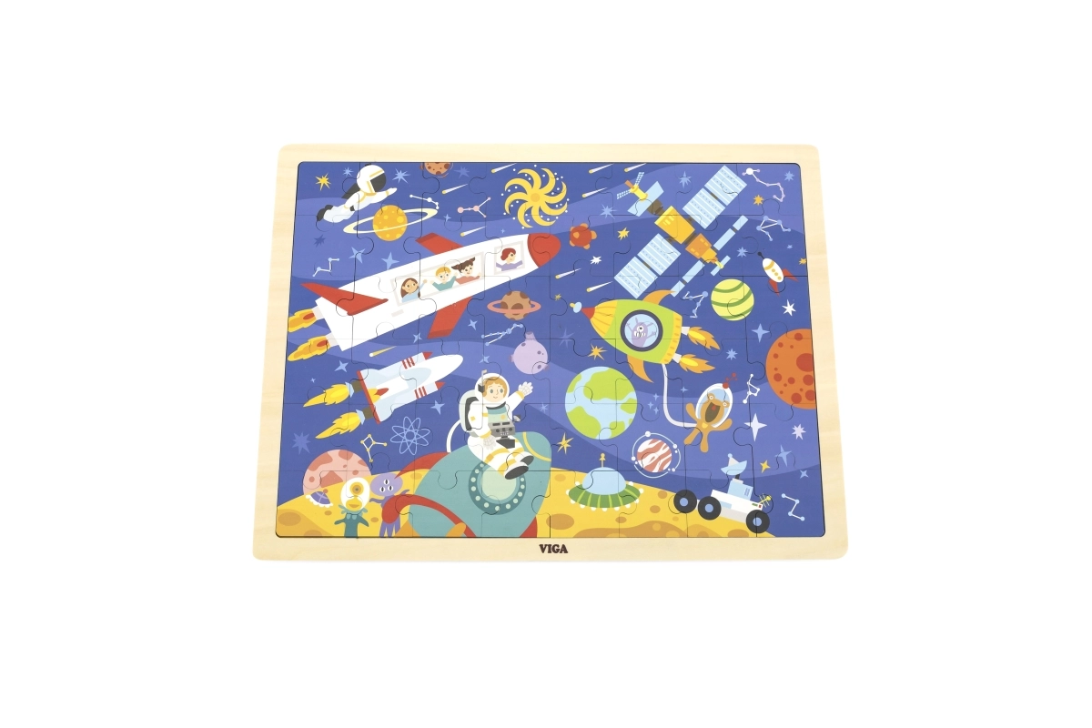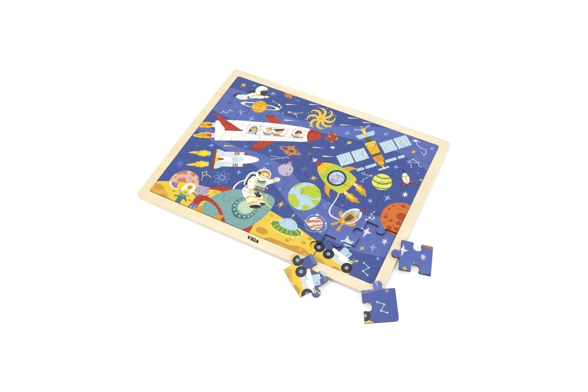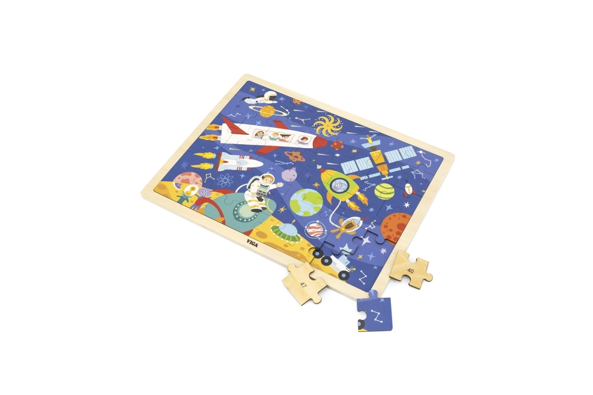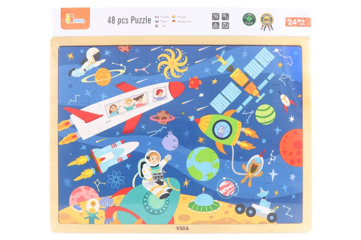 Ova kvalitetna drvena slagalica s 48 dijelova nudi djeci uzbudljivu pustolovinu u svemiru. Šarene ilustracije planeta, raketa i astronauta zadržavaju pažnju i potiču prirodnu znatiželju. Puzzle su smještene u čvrstom drvenom okviru koji olakšava slaganje i prenošenje.