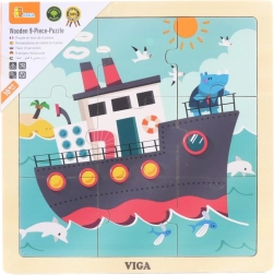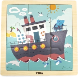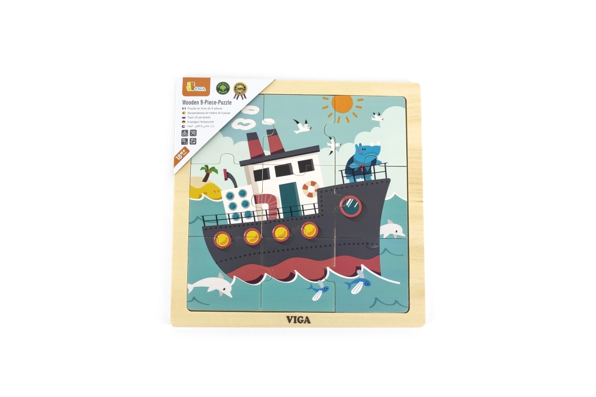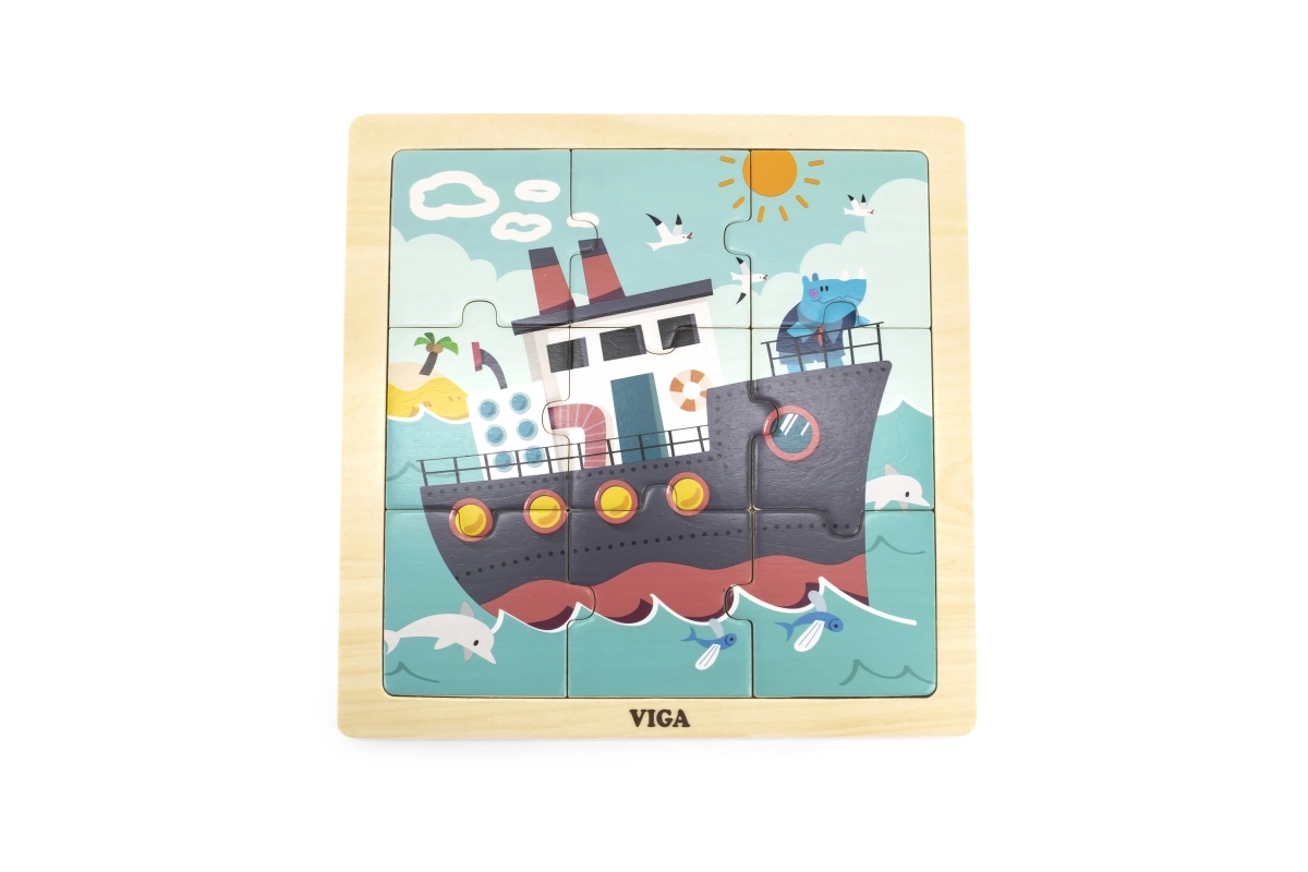Ove drvene puzzle s motivom šarenog broda i morskih životinja sadrže 9 tematskih dijelova koji se umeću u izrezane otvore na ploči. Žive boje i jednostavni oblici potiču koncentraciju i motiviraju djecu na ponovno slaganje.