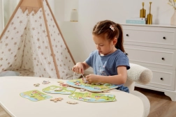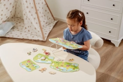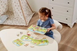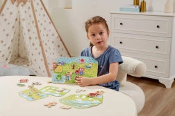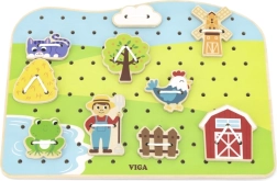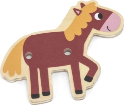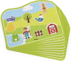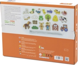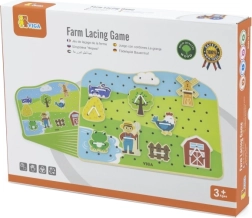 Ovaj set za provlačenje s temom farme idealno je pomagalo za razvoj vještina predškolaca. Djeca prema predlošcima ili vlastitoj mašti provlače vezice kroz šarene drvene dijelove, čime jačaju prste, poboljšavaju hvat te se pripremaju za pisanje i crtanje.
