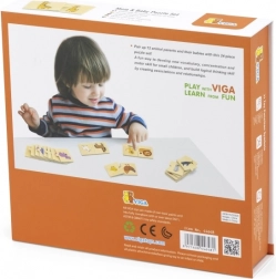 Ovaj kvalitetni drveni set sadrži 24 dijela koji čine 12 životinjskih parova (roditelj + mladunče). Djeca kroz igru upoznaju svijet životinja, uče nove pojmove i vježbaju koordinaciju oko–ruka. Dijelovi su čvrsti, ugodni na dodir i lako ih je uhvatiti malim rukama.