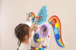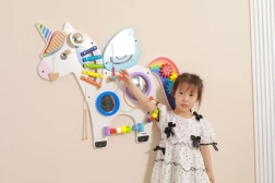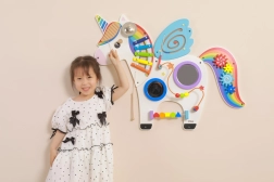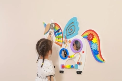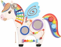 Ova multifunkcionalna zidna ploča u obliku jednoroga spaja glazbene, taktilne i logičke elemente u jednu privlačnu cjelinu. Djeca mogu svirati na ksilofonu, okretati zupčanike, isprobati magnetni labirint i ogledalca te uvježbavati boje, oblike i koordinaciju pokreta.