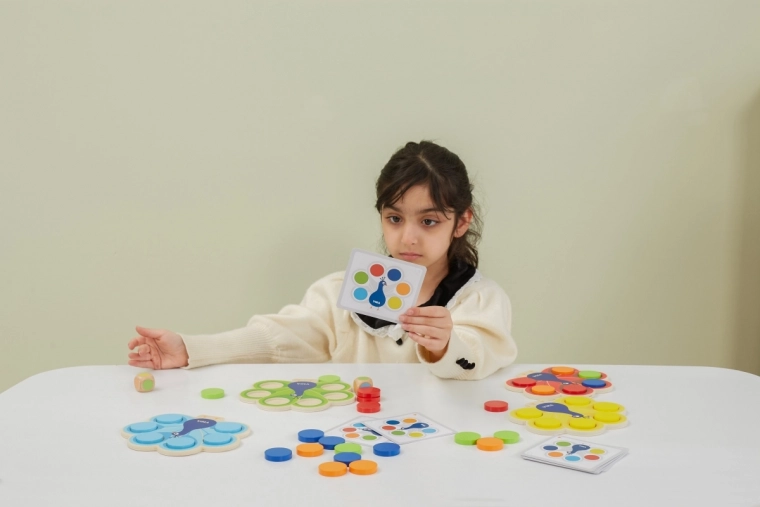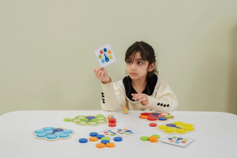 Djeca slažu žetone prema kartama ili bacanju kocke, prirodno usvajaju boje te vježbaju pažnju i logiku.