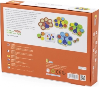 Dječja edukativna igra VIGA paun na zabavan način uči djecu prepoznavanju boja, razvija finu motoriku i oko-ruka koordinaciju. Šareni žetoni umeću se u paunov rep prema kartama ili prema bacanju šarene kocke – idealno za Montessori učenje, koncentraciju i zajedničku igru.