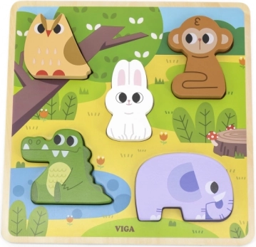 Otkrijte zabavne drvene slagalice VIGA s motivom šume koje razvijaju dječje vještine već od 18 mjeseci. Šarena podloga i 5 životinjskih dijelova potiču finu motoriku, koordinaciju oko–ruka i logičko razmišljanje. Djeca će se zabaviti slažući i istodobno vježbati prepoznavanje oblika i pamćenje.