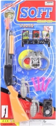 - Plastična puška na potez, 4× strelica s usisnom čašicom, 2× granata (cca 9 cm), voki-toki, lisice, značka, meta (cca 13,5 × 8 cm)