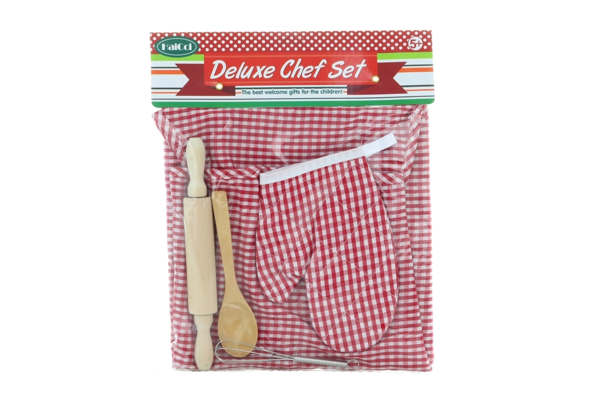 Set je osmišljen za udobno korištenje dječjim rukama te potiče samostalnost, maštu i pozitivan odnos prema hrani i kuhanju. Pregača i rukavica štite odjeću i pružaju osjećaj pravog kuhara.