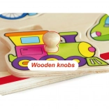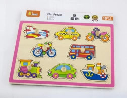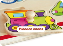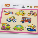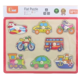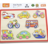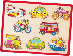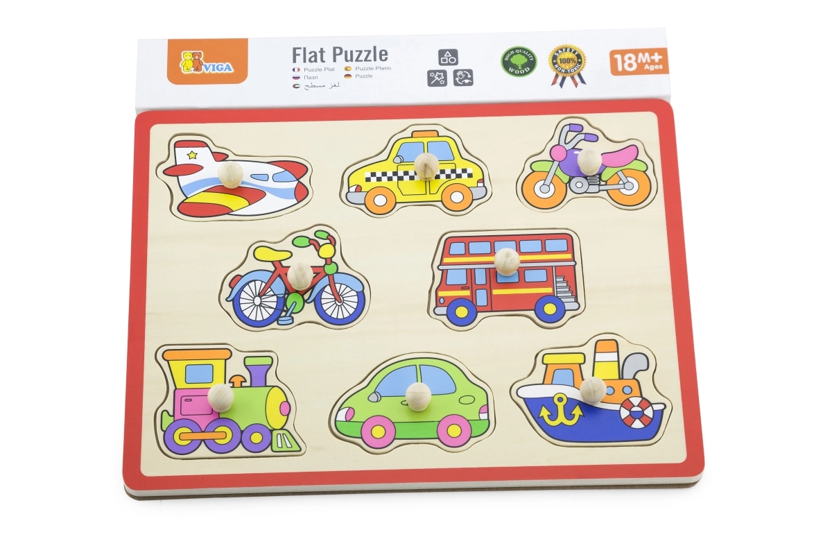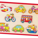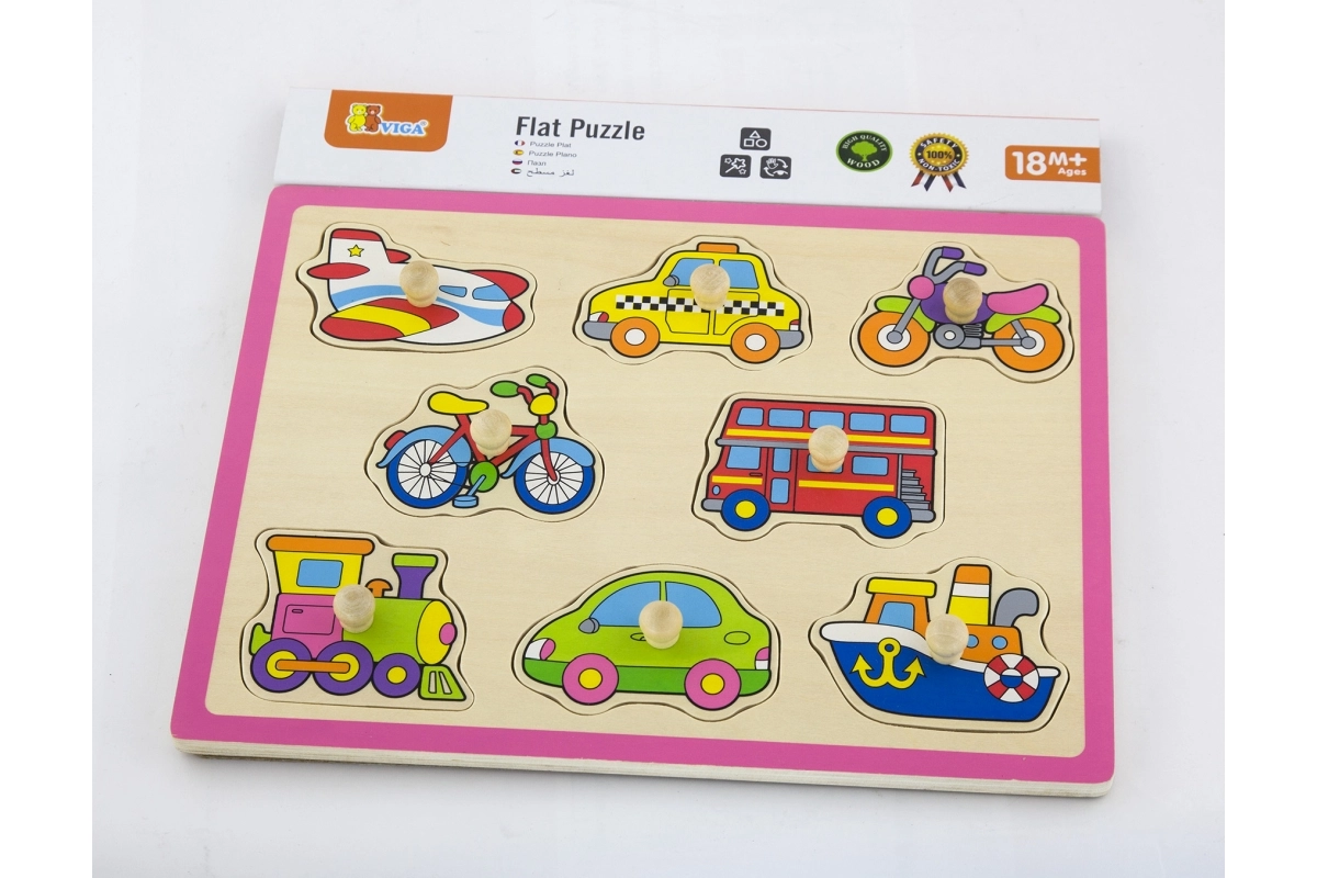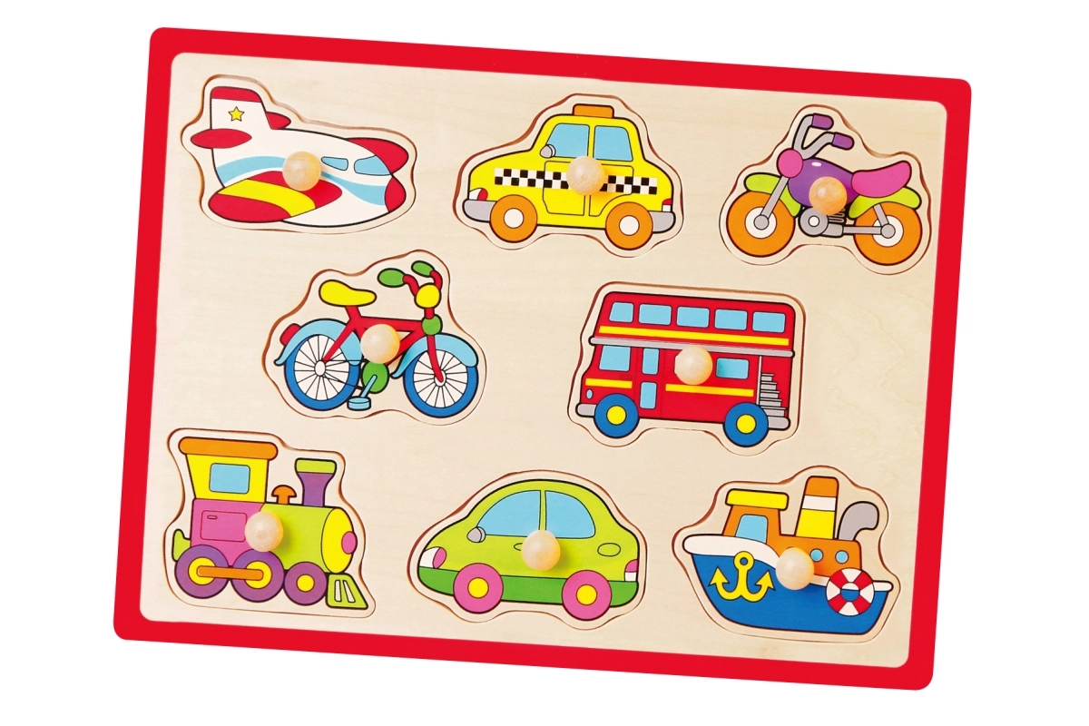 Ova kvalitetna drvena slagalica s motivima vozila (avion, taksi, bicikl, autobus i dr.) nudi zabavan način učenja. Dijelovi s praktičnim držačima uklapaju se u unaprijed izrezane otvore pa djeca prirodno vježbaju spretnost i logičko razmišljanje. Čvrsta drvena ploča dimenzija cca 30 × 22,5 cm izdržljiva je i prikladna za svakodnevnu igru.