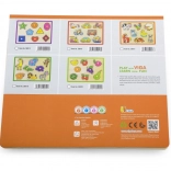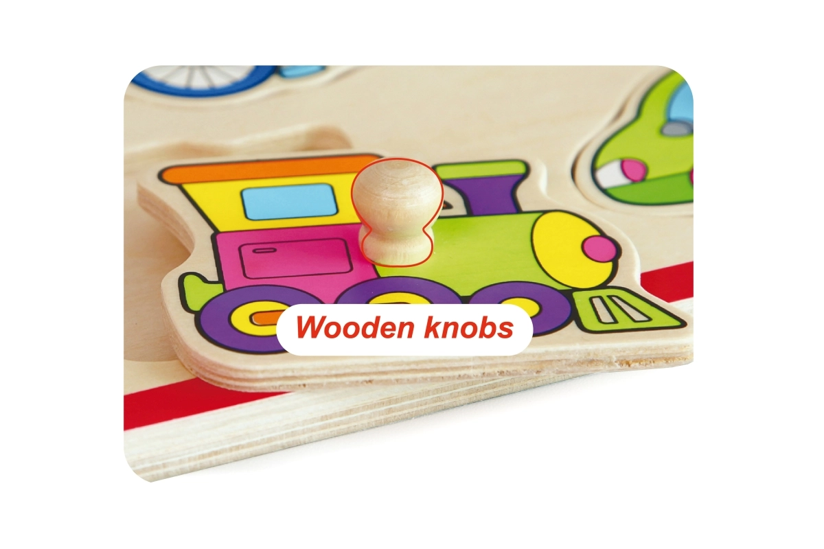 Svaki dio ima drveni držač zahvaljujući kojem djeca lako podižu i točno umeću oblik na njegovo mjesto – idealno za vježbanje fine motorike.