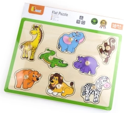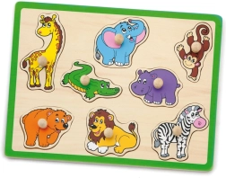 Ova kvalitetna drvena umetaljka s motivom džungle donosi djeci radost otkrivanja životinja poput žirafe, slona, krokodila, lava i zebre. Svaki dio ima praktični drveni gumbić za lako držanje i precizno umetanje u odgovarajući oblik. Robusna ploča s izraženim zelenim rubom izdržljiva je i dobro stoji na stolu ili podlozi.