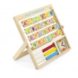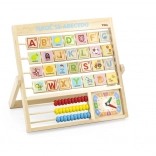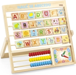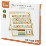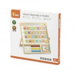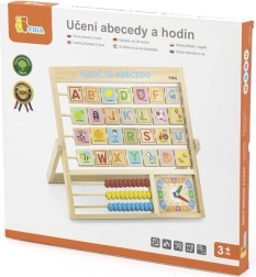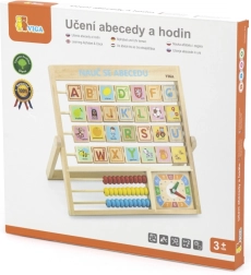 Drvena abeceda i sat na češkom jeziku. Djeca mogu naučiti slova, brojeve i steći opću predodžbu o satu. Svako slovo ima na poleđini riječ radi lakšeg pamćenja. Dimenzije cca 32,5 x 32 x 2,3 cm. Dimenzije pakiranja cca 34 x 32,5 x 3 cm. Dob 3+
