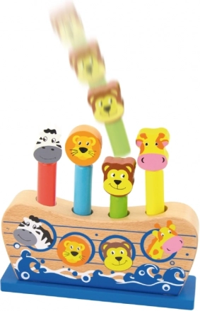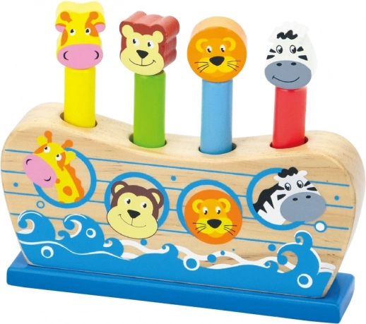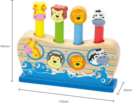 Stabilna drvena baza u obliku broda i četiri drvena štapića sa životinjama (žirafa, majmunčić, lav, zebra) stvaraju sigurno i izdržljivo okruženje za igru. Estetsko pakiranje prikladno je kao idealni poklon za predškolce i mališane.