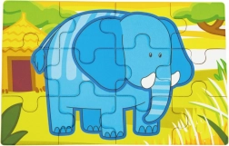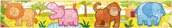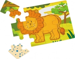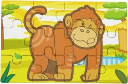 Jednostavni oblici i naglašene boje lava, slona, nilskog konja i majmunčića motiviraju djecu na slaganje i potiču vizualnu percepciju.