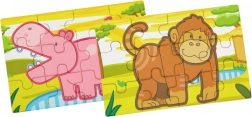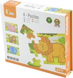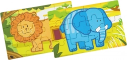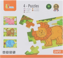 Ovaj set drvenih slagalica s veselim životinjicama iz džungle razveselit će svako dijete. Svaki motiv ima jasne boje i jednostavne oblike koji olakšavaju slaganje i prirodno razvijaju dječju maštu. Iz dijelova je moguće složiti i četiri zasebne slike i jednu dugu panoramsku sliku svih životinja.