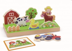 • Drvene figure farme: štala, ograda, djevojčica, stablo jabuke, krava, pijetao, gredica cvijeća, patka, konjić i traktor s farmerom.