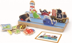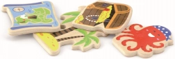 • Drvene figure mora: svjetionik, rak, top, hobotnica, kit, papiga, otok s palmama, kovčeg s blagom, karta i gusarski brod.
