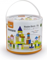 Ovaj drveni set za izgradnju nudi 75 raznobojnih kockica za stvaranje gradskih scenarija. Paket uključuje ilustriranu brošuru s uputama koja inspirira djecu na kreativno građenje. Sve je upakirano u praktičnu kantu s ručkom dimenzija cca 22,5 x 20 cm.