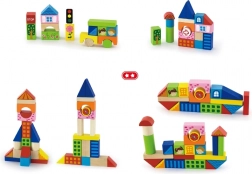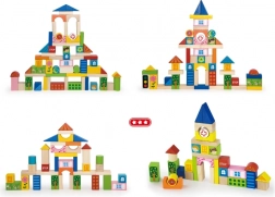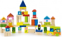 Set uključuje kocke različitih veličina, od 2,5 cm do 7,5 cm, što omogućuje djeci stvaranje različitih građevina kao što su kuće, mostovi i drugi gradski elementi. Zahvaljujući izdržljivom drvenom materijalu, kocke su pogodne za dugotrajnu i sigurnu igru.