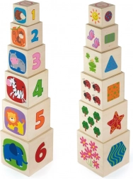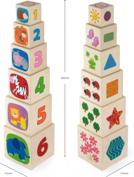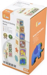 Set sadrži 6 čvrstih drvenih kocki različitih veličina od kojih djeca mogu sagraditi stabilnu kulu ili ih umetati jednu u drugu. Bogate ilustracije sa životinjama, bojama, oblicima i mnoštvom elemenata podupiru rano učenje i proširuju rječnik.