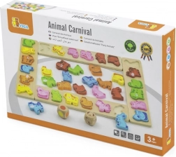 Otkrijte kreativni svijet s igrom Karneval životinja – drvenom edukativnom igrom koja spaja učenje i zabavu. Šarene, robusne pločice osmišljene su za male dječje ruke i potiču finu motoriku, koncentraciju i logičko razmišljanje. Zahvaljujući raznim varijantama igre djeci nikada neće biti dosadno.