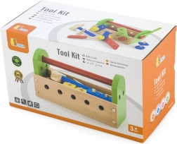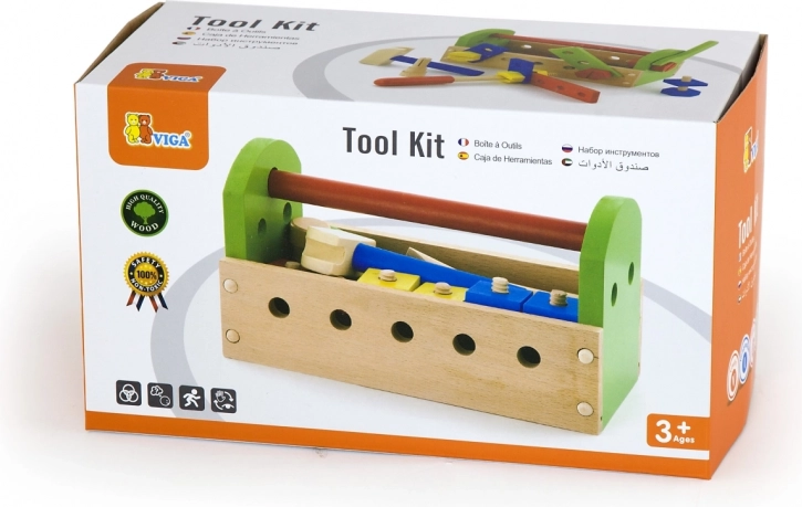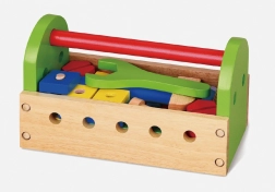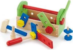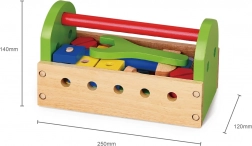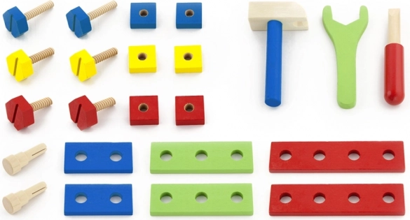 Ovaj kvalitetni drveni set alata u robusnoj nosiljci idealan je za prve građevne pokušaje. Djeca vježbaju finu motoriku, logičko razmišljanje i koordinaciju oko–ruka pri zavrtanju, zabijanju i zatezanju. Šarene komponente i realistični alati potiču kreativnu i ulogovnu igru.