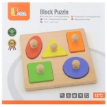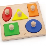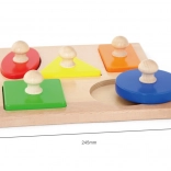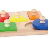 Drvena slagalica za djecu s pet šarenih oblika i velikim okruglim hvataljkama. Potiče prepoznavanje oblika i boja, potiče razvoj fine motorike i koordinacije ruku.