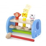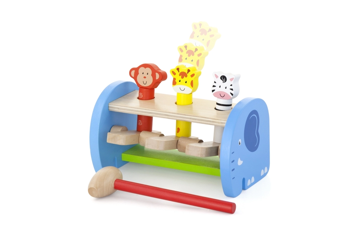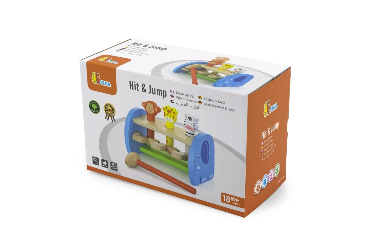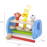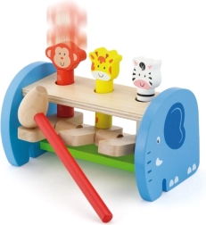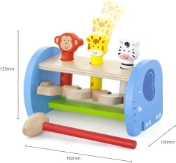 Ova kvalitetna drvena igračka nudi sigurnu i šarenu igru s preslatkim životinjicama. Djeca pomoću čekića lupkaju po mehanizmu koji životinjice tjera da iskoče – tako usavršavaju hvat, snagu stiska i preciznost pokreta. Čvrsta konstrukcija i glatki rubovi osiguravaju sigurnost pri svakodnevnom korištenju.