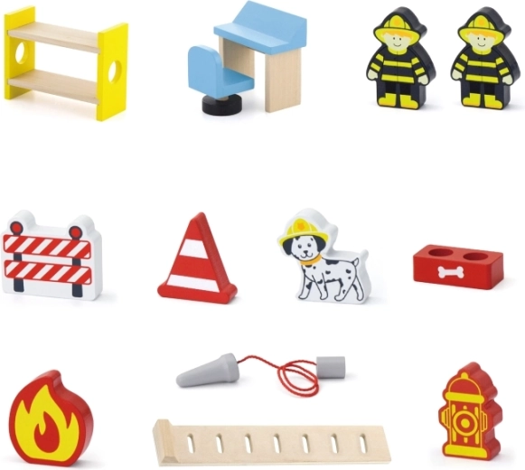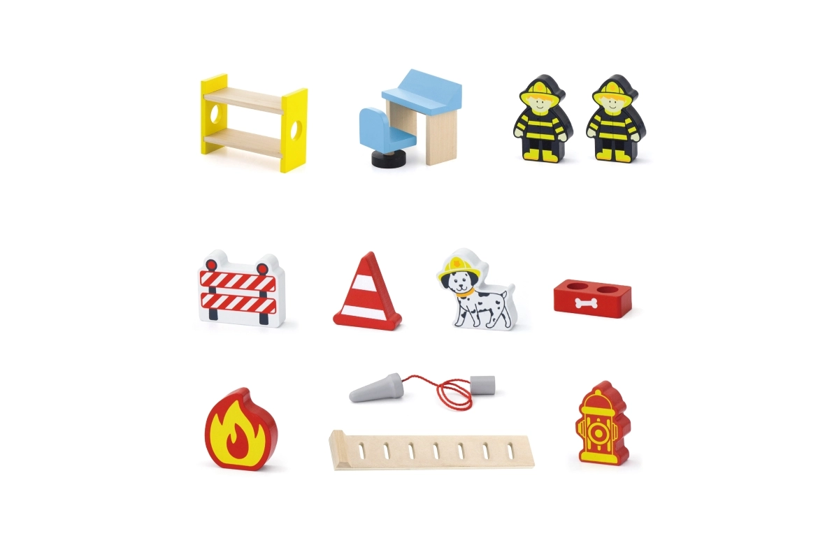 U pakiranju se nalazi sve za trenutačnu igru: zgrada postaje, 2 vatrogasca, helikopter, vatrogasno vozilo, hidrant, krevet na kat, stolac, upravljačka ploča i ljestve. Materijali i boje su sigurni i netoksični kako bi se djeca mogla igrati bez brige. Idealno kao dar koji veseli i dugo traje.