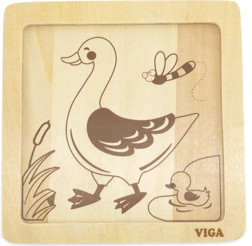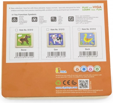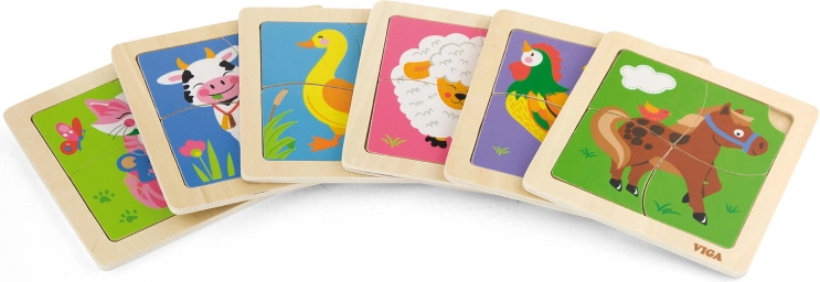 Drvene slagalice Viga sadrže četiri tematska dijela koji se lako postavljaju na ploču s ilustracijom. Svaki dio izrađen je od kvalitetnog drva i obojen sigurnim, netoksičnim bojama, koje osiguravaju sigurnost djece i zaštitu okoliša.