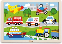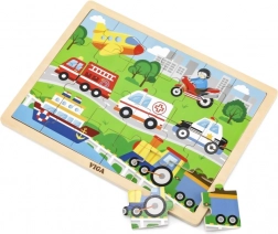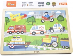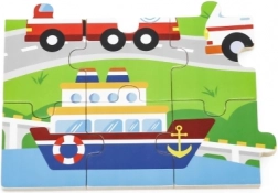 Ova drvena slagalica s prikazima prijevoznih sredstava izvrstan je izbor za prve “veće” puzzle. Zahvaljujući 24 dijela, slaganje je taman izazovno – potiče koncentraciju i donosi zadovoljstvo dovršenom slikom dimenzija cca 27,5 × 20 cm. Šarene ilustracije vozila (sanitetsko vozilo, vatrogasno vozilo, policijski auto, brod, zrakoplov i dr.) prirodno motiviraju djecu na ponovno igranje.